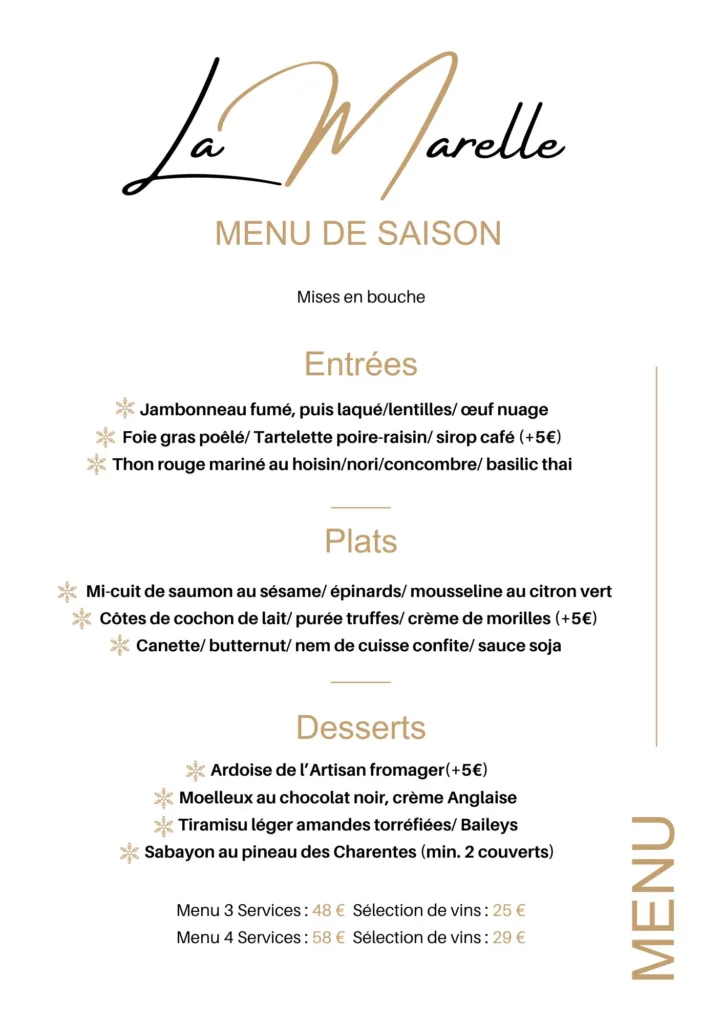 Nouveau menu à partir de ce mercredi 5 mars Découvrez nos nouveaux menus dès ce mercredi soir ! Au Restaurant La Marelle, nous mettons à l’honneur les produits de nos producteurs locaux. Au menu : Des mises en bouche savoureuses Des entrées raffinées Des plats généreux et de saison Nous adaptons nos plats aux enfants, […]