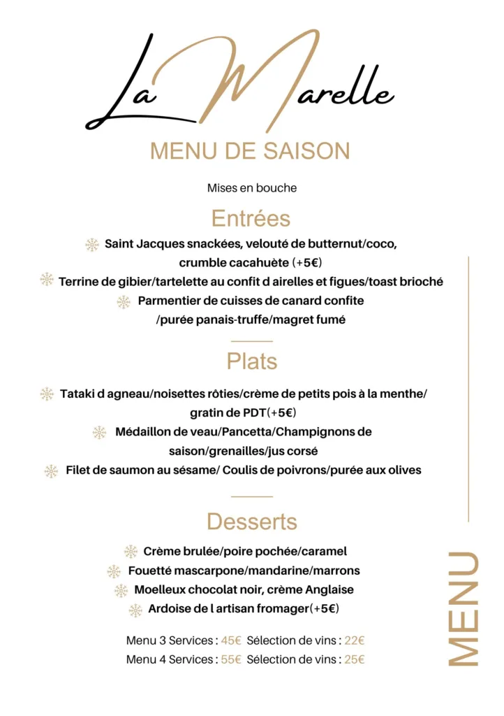 Nouveau menu à partir de ce mercredi 5 mars Découvrez nos nouveaux menus dès ce mercredi soir ! Au Restaurant La Marelle, nous mettons à l’honneur les produits de nos producteurs locaux. Au menu : Des mises en bouche savoureuses Des entrées raffinées Des plats généreux et de saison Nous adaptons nos plats aux enfants, […]
